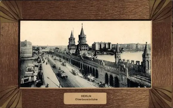 Passepartout Ak Berlin Friedrichshain, Ansicht der Oberbaumbrücke, Hochbahn Haltestelle, Kutschen