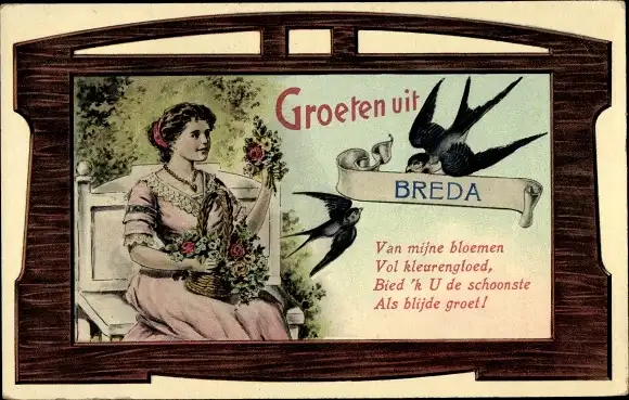 Passepartout Ak Breda Nordbrabant, Frau mit Blumenkorb, Schwalben