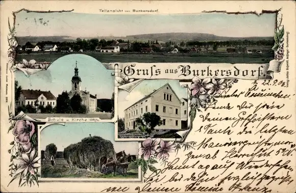 Passepartout Ak Burkersdorf Zittau in Sachsen, Teilansicht, Kirche, Schule, Heufuhrwerk
