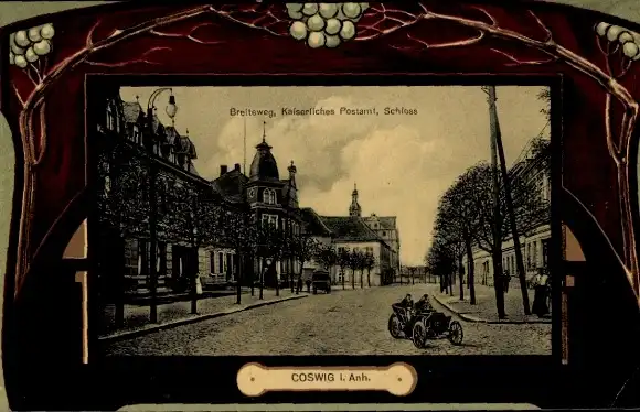 Passepartout Ak Coswig in Anhalt, Breiteweg, Kaiserliches Postamt, Schloss