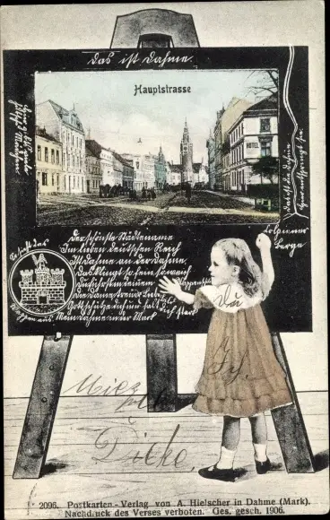 Passepartout Ak Dahme in der Mark, Hauptstraße, Kirchturm, Wappen, Mädchen an Tafel