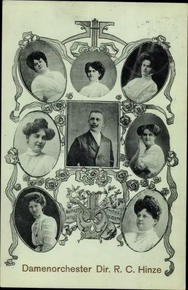 Passepartout Ak Damenorchester Dir. R. C. Hinze, Frauenportraits, Mann
