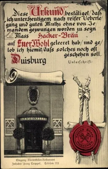 Passepartout Ak Duisburg im Ruhrgebiet, Börsenkeller Restaurant, Urkunde, Hacker Bräu