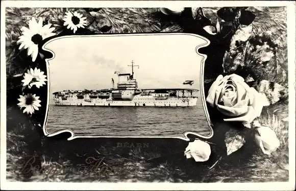 Passepartout Ak Französisches Kriegsschiff Bearn, Flugzeugträger, Glückwunsch Neujahr, Rosen