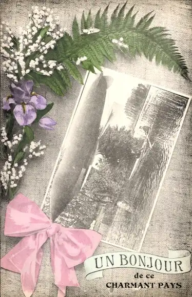 Passepartout Ak Französisches Luftschiff über einem See, Paar im Ruderboot