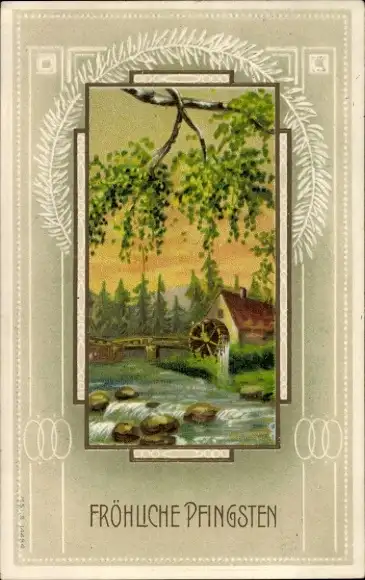 Passepartout Ak Frohe Pfingsten, Birkenzweig, Wassermühle