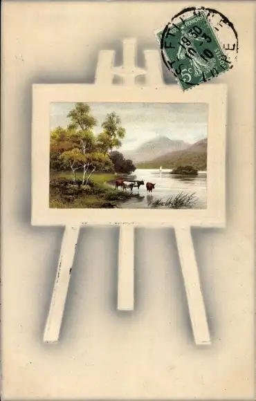 Passepartout Ak Gemälde auf einer Staffelei, Landschaftsansicht