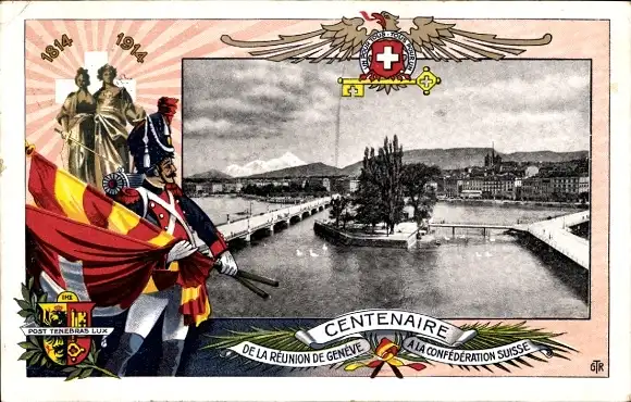 Passepartout Ak Genève Genf Schweiz, 100. Jahrestag der Genfer Wiedervereinigung, 1814-1914