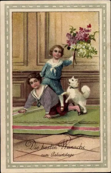 Passepartout Ak Glückwunsch Geburtstag, Kinder, Blumenstrauß, Hund