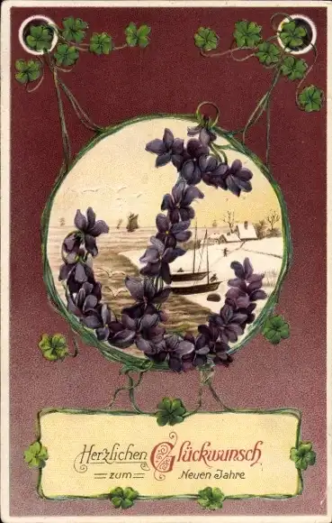 Passepartout Ak Glückwunsch Neujahr, Klee, Anker
