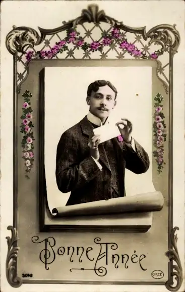 Passepartout Ak Glückwunsch Neujahr, Mann mit einem Brief