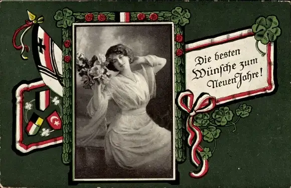 Passepartout Ak Glückwunsch Neujahr, Patriotik, Kleeblätter, Frauenportrait