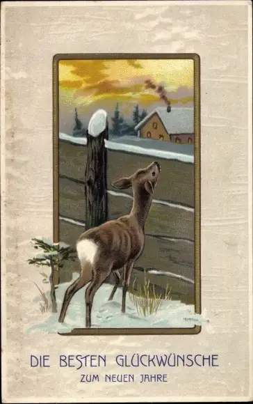 Passepartout Ak Glückwunsch Neujahr, Reh steht vor einem Zaun