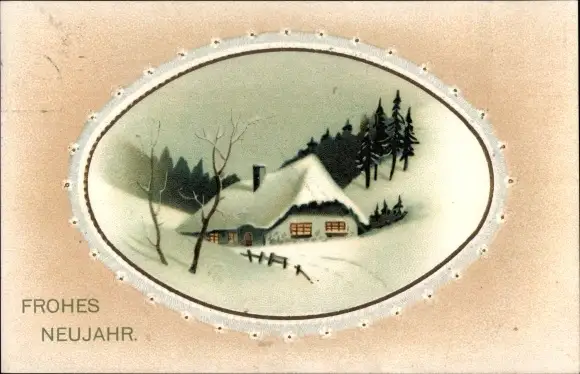 Passepartout Ak Glückwunsch Neujahr, Winterlandschaft, schneebedecktes Haus