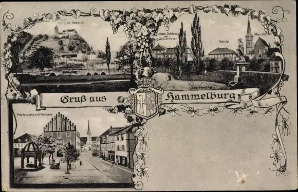 Passepartout Ak Hammelburg in Unterfranken Bayern, Markt, Rathaus, Schloss Saaleck, Schule
