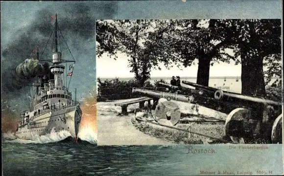 Passepartout Ak Hansestadt Rostock, Fischerbastion, Kanonen, Kriegsschiff
