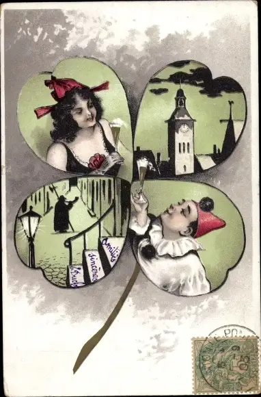 Passepartout Ak Harlekin, Kleeblatt, Sekt