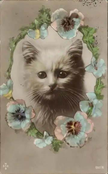 Passepartout Ak Katze, Tierportrait, Stiefmütterchen