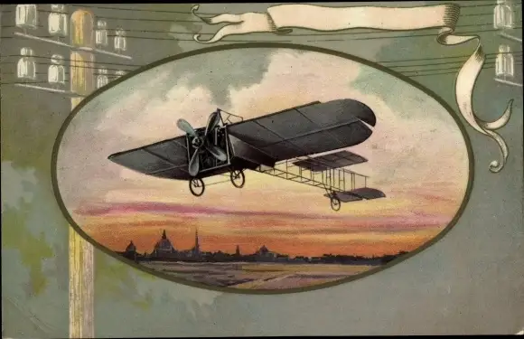 Passepartout Ak Künstler Ak Flugzeug, Monoplan in der Dämmerung