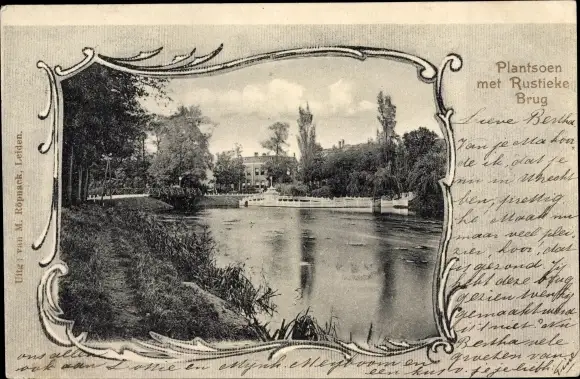 Passepartout Ak Leiden Südholland Niederlande, Plantsoen met Rustieke Brug