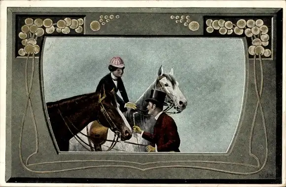 Passepartout Ak Liebespaar, Frau auf einem weißen Pferd, Zaumzeug