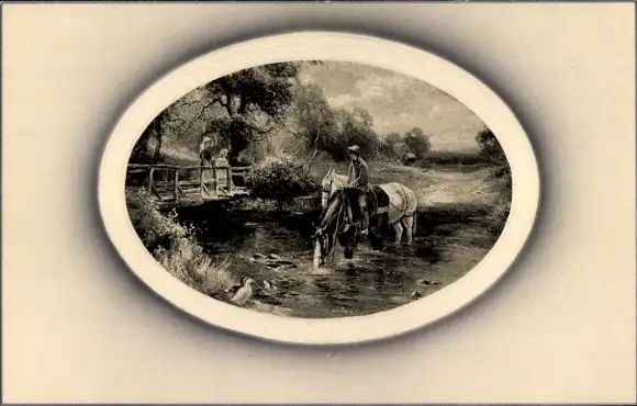 Passepartout Ak Mann mit Pferden in einem Fluss
