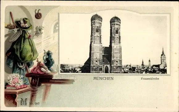 Passepartout Ak München, Frauenkirche, Wanderrucksack