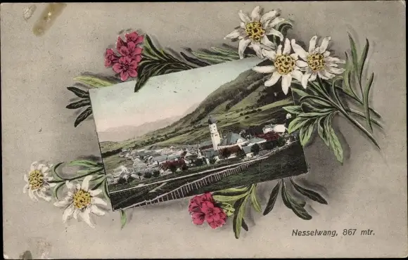 Passepartout Ak Nesselwang im Allgäu, Blick auf den Ort, Kirche, Edelweiß