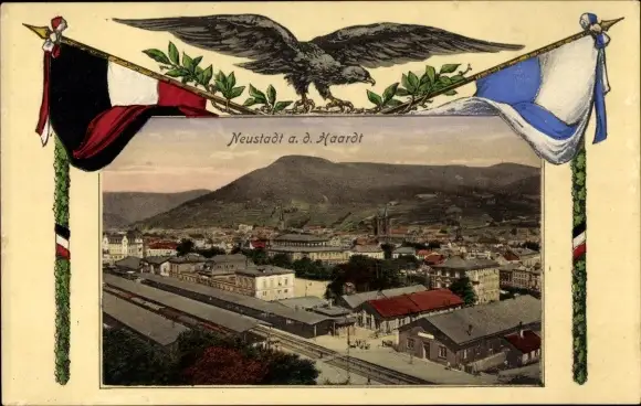 Passepartout Ak Neustadt an der Haardt Neustadt an der Weinstraße, Totalansicht mit Bahnhof