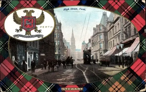 Passepartout Ak Perth Schottland, High Street, Wappen, Tartan Stewart