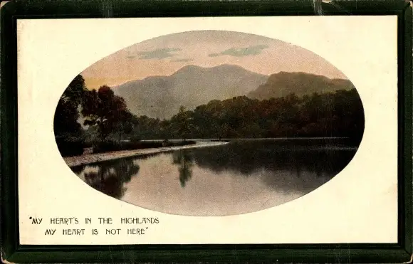 Passepartout Ak Schottland, Highlands, See, Berge, Zitat