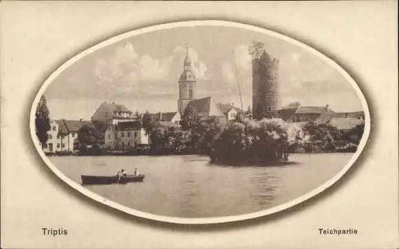 Passepartout Ak Triptis in Thüringen, Teilansicht, Teich, Türme der Stadt