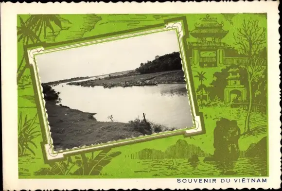 Passepartout Ak Vietnam, Flusspartie, Tempel, Palmen