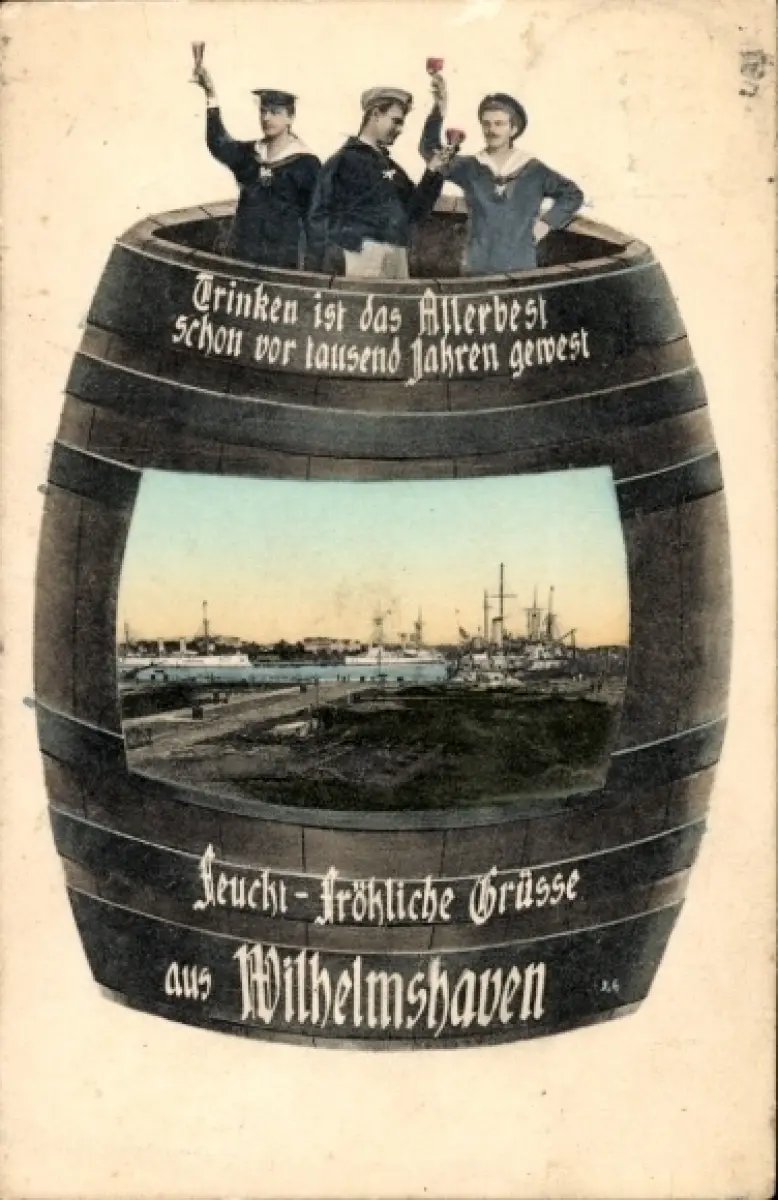 Passepartout Ak Wilhelmshaven an der Nordsee, Seeleute, Kriegsschiffe, Weinfass