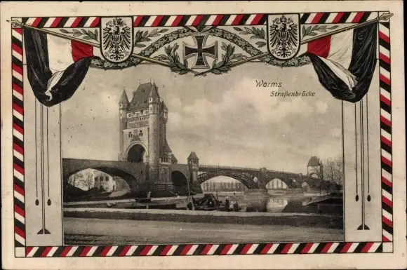 Passepartout Ak Worms am Rhein, Straßenbrücke, Eisernes Kreuz, Fahnen, Wappen