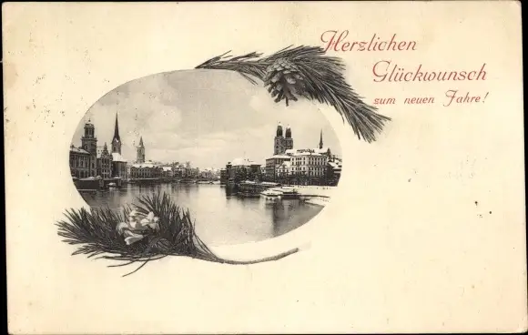 Passepartout Ak Zürich Stadt Schweiz, Stadtansicht mit See, Winter, Zweige