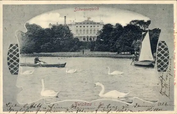 Passepartout Ak Zwickau in Sachsen, Schwanenteich, Ruderboot, Segelboot