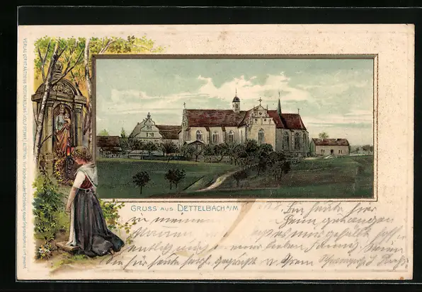 Passepartout-Künstler-AK Dettelbach, Ortspartie mit Kirche
