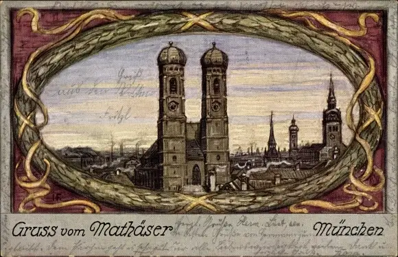 Passepartout Künstler Ak München, Partie am Mathäser, Teilansicht der Stadt, Frauenkirche