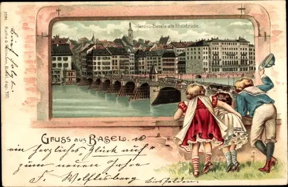 Passepartout Litho Basel Stadt, Gross Basel, alte Rheinbrücke