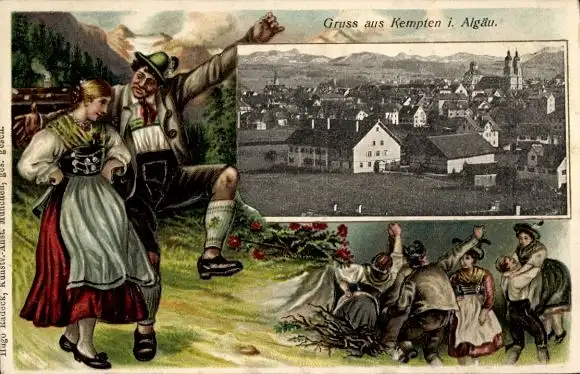 Passepartout Litho Kempten im Allgäu Schwaben, Stadt, Tanzpaar in Tracht