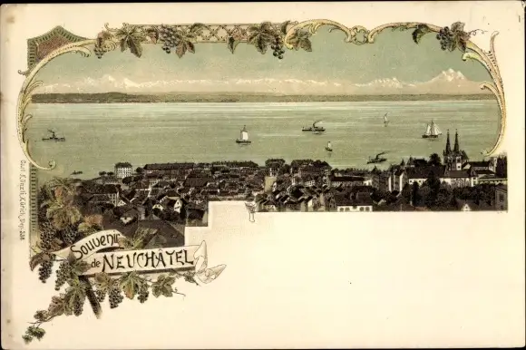 Passepartout Litho Neuchâtel Neuenburg Stadt, Panorama, See
