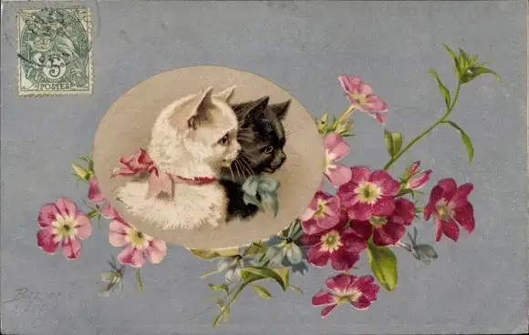 Passepartout Litho Zwei Katzen mit Halsband, Blumen