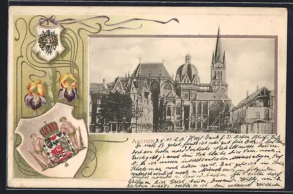 Passepartout-Lithographie Aachen, Blick zum Dom, Wappen
