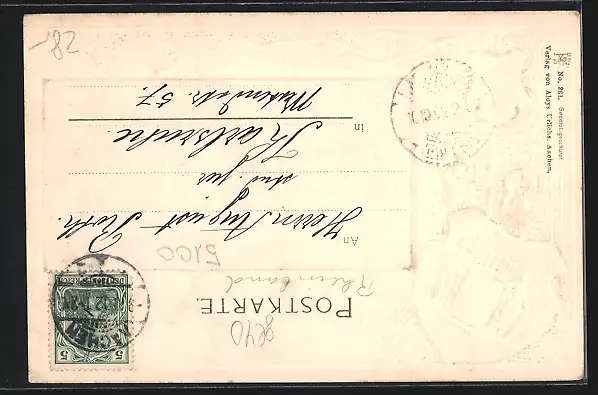 Personenbezogene Daten auf der Rückseite der Karte wurden durch blauen Textmarker unkenntlich gemacht. Die blauen Stellen sind auf die Vorderseite durchgeweicht und wirken sich negativ auf das Postkartenfoto aus