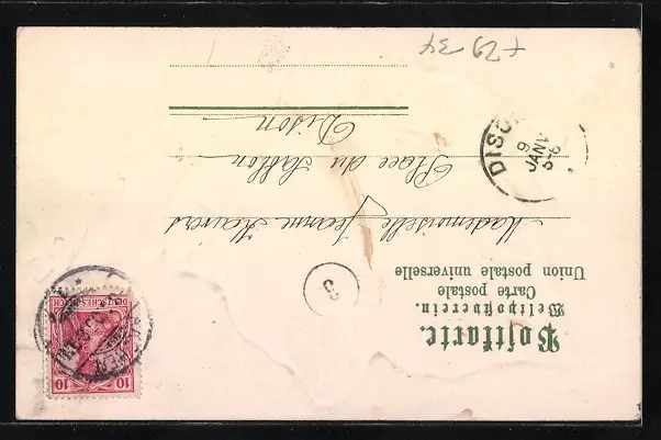 Personenbezogene Daten auf der Rückseite der Karte wurden durch blauen Textmarker unkenntlich gemacht. Die blauen Stellen sind auf die Vorderseite durchgeweicht und wirken sich negativ auf das Postkartenfoto aus