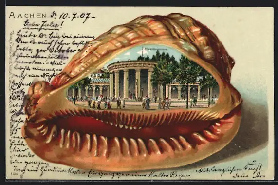 Passepartout-Lithographie Aachen, Muschel mit Partie am Elisenbrunnen