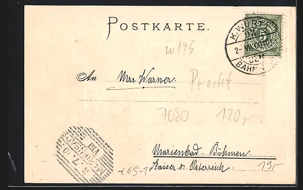 Personenbezogene Daten auf der Rückseite der Karte wurden durch blauen Textmarker unkenntlich gemacht. Die blauen Stellen sind auf die Vorderseite durchgeweicht und wirken sich negativ auf das Postkartenfoto aus