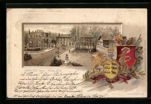 Passepartout-Lithographie Aalen, Strassenpartie mit Passanten, Wappen