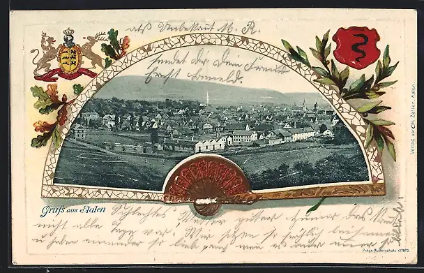 Passepartout-Lithographie Aalen, Teilansicht im Fächer-Passepartout, Wappen